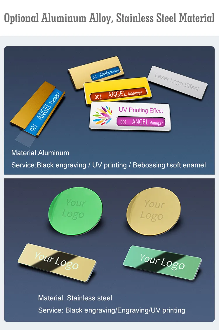 Hot sale promotional metal print waiter staff magnet name tag plate decorative reusable blank sublimation epoxy logo custom magnetic name badge with safety pins |